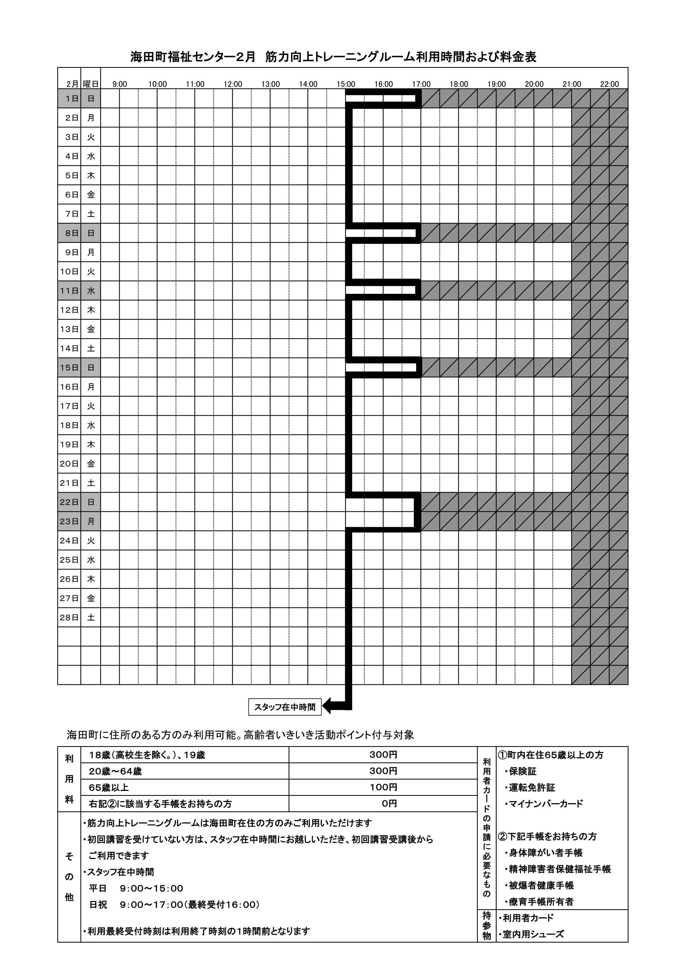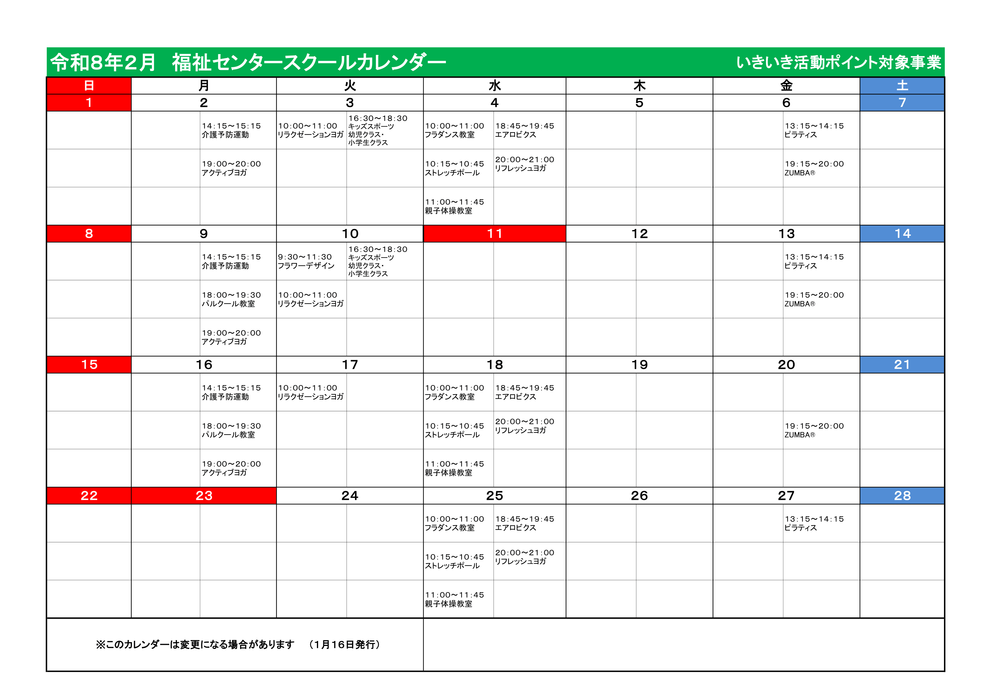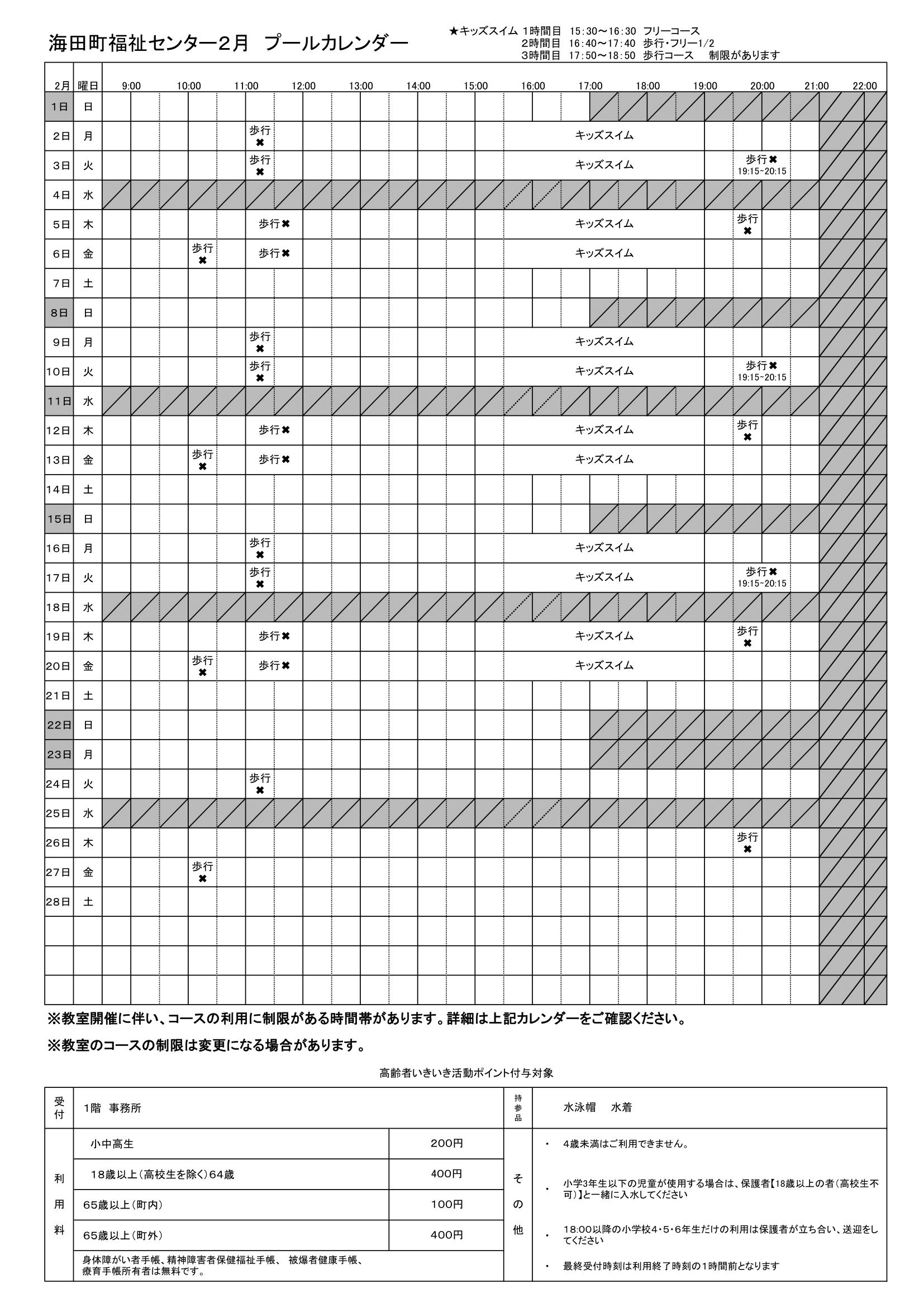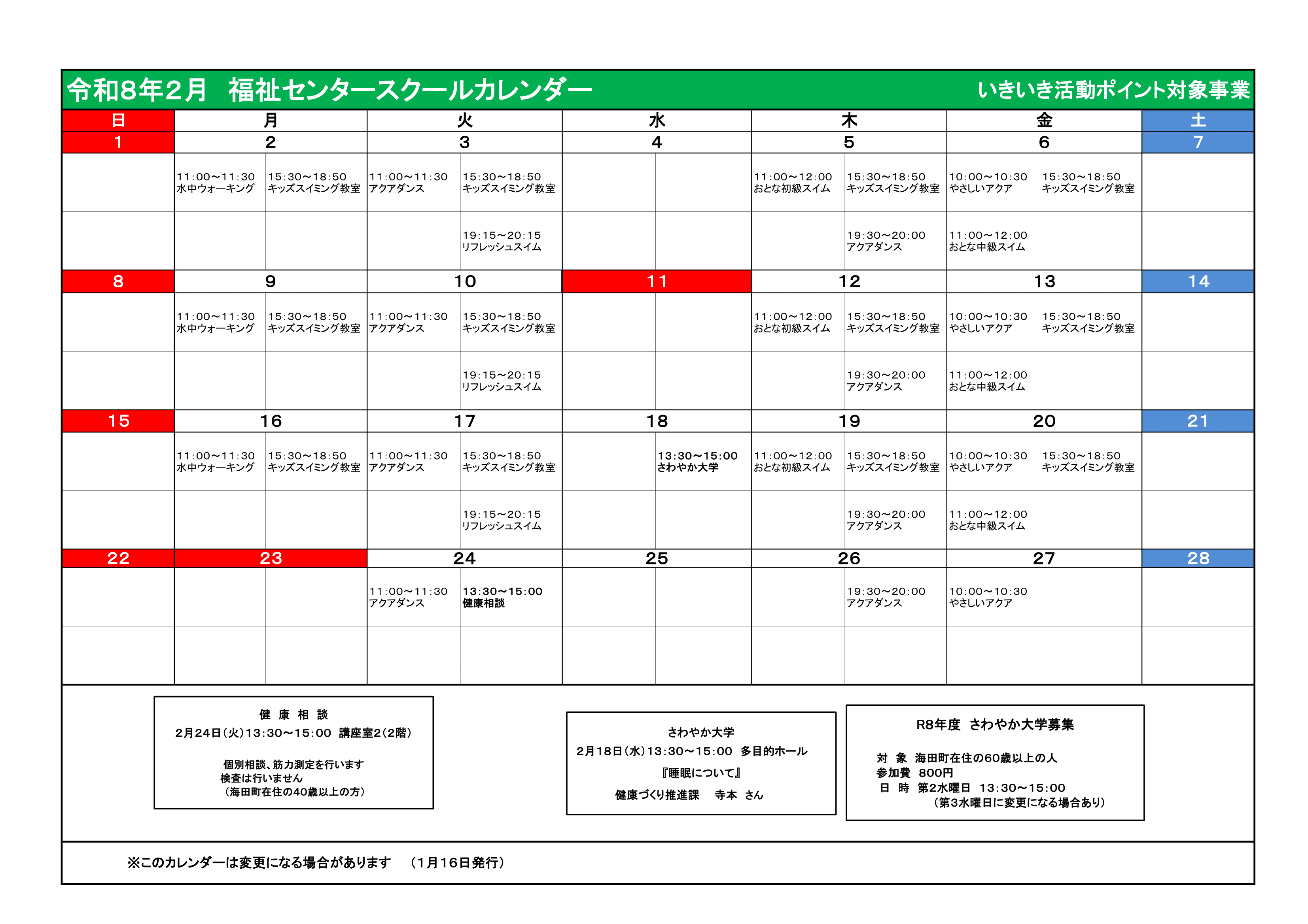 2月トレーニングルーム、プール、福祉センタースクール、行事予定表を公開いたしました。スマートフォン等でご覧の方は、画像を長押しして、「画像を保存」または「ダウンロード」を押すとお持ちのスマートフォンに保存することができます。